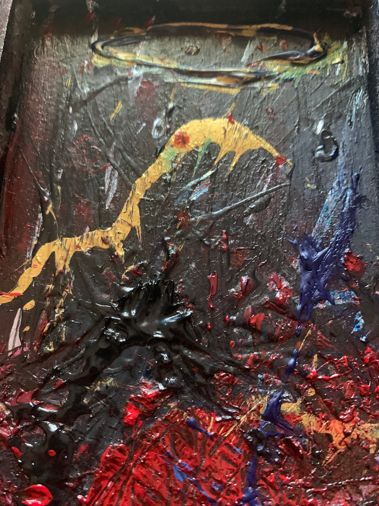 The image suggests a captured “ghost of fear,” held still inside the frame, transformed into a protective talisman for whoever keeps it. The piece carries the same raw energy found in my performance paintings but in a compact, intimate form.