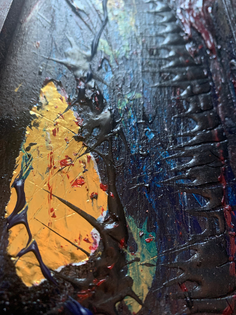 This one-of-one painting by Curse Mackey is built inside a cross-shaped wooden frame, with a recessed panel that holds the painted surface. Layers of acrylic, texture mediums, and splattered pigment form a dense, expressive field — reds, blacks, gold, and blue streaks moving through a dark center.
