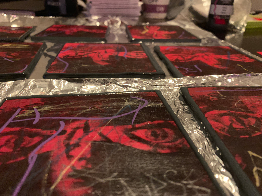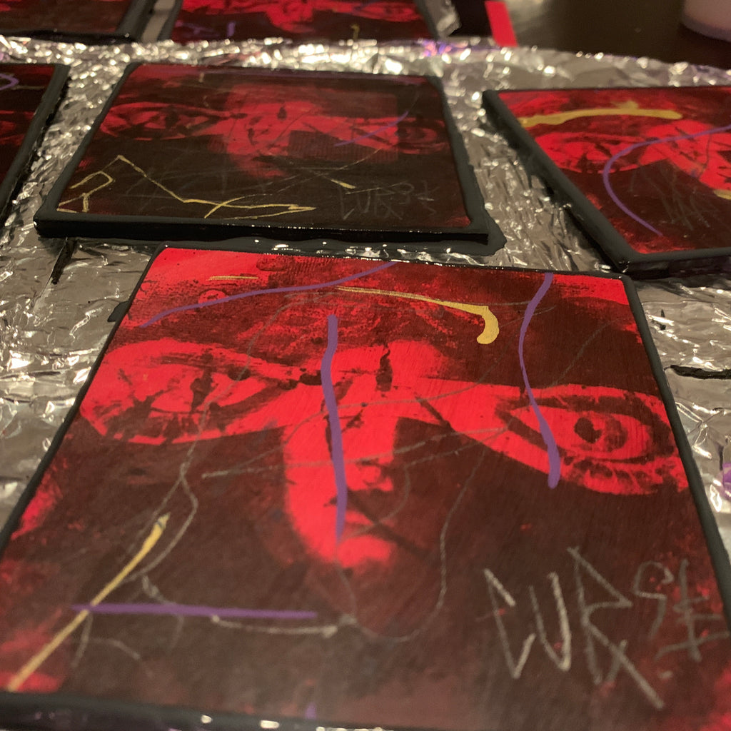 Each of the 44 pieces was hand-embellished by Curse, one at a time, with paint, markers, pencil, ink, and then brushed with a coat of medium-matte finish.